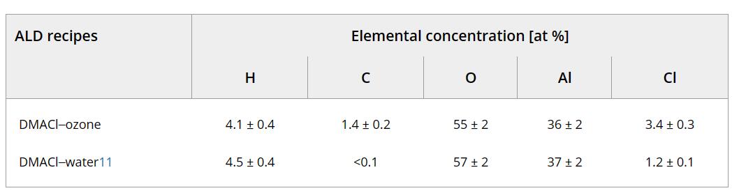 表1 DMACl -臭氧和DMACl -水ALD中大部分Al2O3薄膜中元素濃度的比較。在200℃下沉積400個ALD循環(huán)。