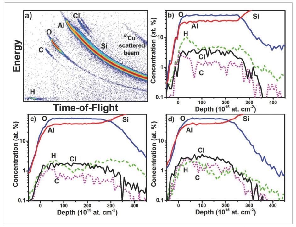 圖3:在ToF-ERDA測量中,可以通過測量每個反沖原子的飛行時間和能量來分離不同的質(zhì)量。Al2O3膜的元素深度分布:b)用7秒臭氧脈沖時間沉積時,c)用20秒臭氧脈沖LT+HT處理后,以及d)用7 s臭氧脈沖LT+T處理后。a) 與(c)中的深度剖面相對應(yīng)的直方圖。該膜在200°C下以400次ALD循環(huán)沉積。注:由于直方圖中Al和Si在Si/Al2O3界面處的截面重疊,因此將Al和Si的深度分布繪制為一體。