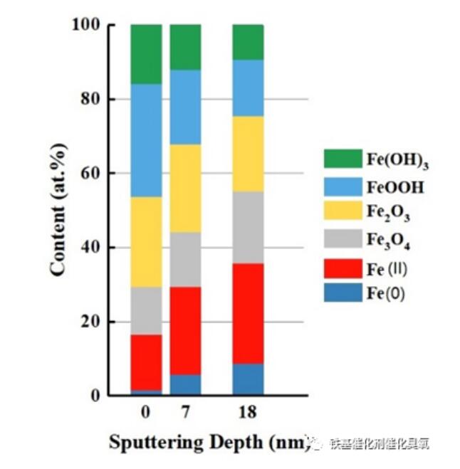 我們的鐵基催化劑與其他催化劑不同,不是通過“浸漬”、“燒結”等工序制備的;而是通過在液相中迅速氧化,使鐵刨花表面形成致密γ-FeOOH膜(當然是相對的,詳見XPS蝕刻表征圖,表面以Fe(III)為主),成為臭氧分解的催化層;同時,它又是內部Fe(0)氧化的鈍化層。這種制備方法優點:一是工藝簡單,一步完成;二是表面主要成份為γ-FeOOH,催化臭氧效果好。而燒結方法,表面不會形成過渡金屬羥基化物(Me-OH),理論認為:表面羥基(-OH)才是催化臭氧的有效官能團。