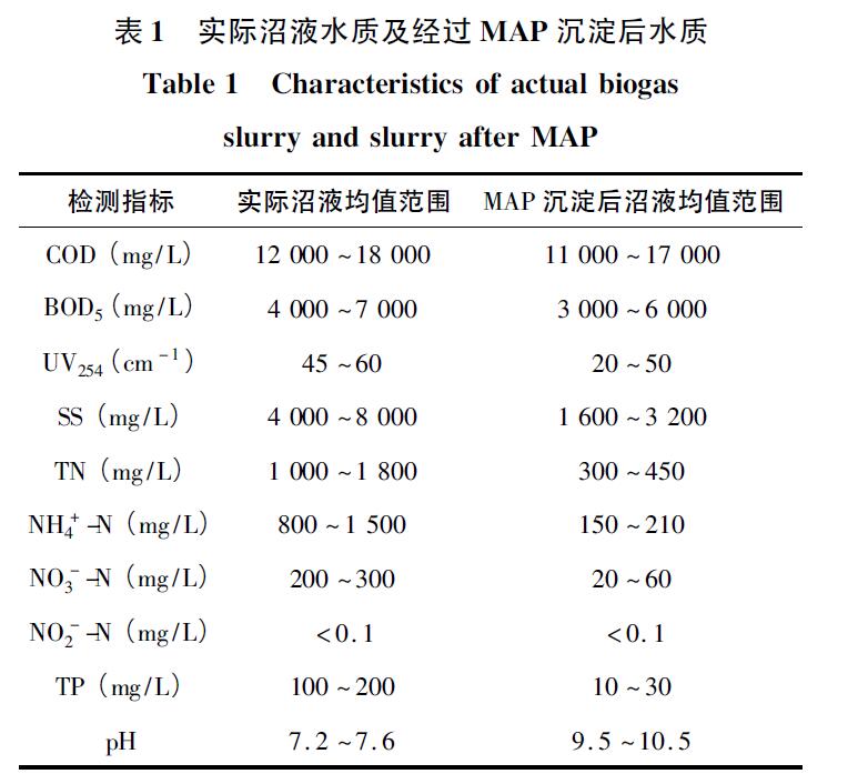 實驗所用厭氧沼液取自陜西省楊凌示范區(qū)某產(chǎn)業(yè)集團生豬實訓(xùn)基地。該場生豬出欄量為18 萬頭/a,豬場廢水主要來自糞尿、豬舍沖洗水,豬場廢水由露天排水溝匯入?yún)捬跽託獬刂校M行1 ~ 2 個月厭氧發(fā)酵。厭氧發(fā)酵后的沼液以MgCl2和Na2HPO4為沉淀劑,進行MAP 沉淀反應(yīng)前處理。實際沼液水質(zhì)及經(jīng)過MAP 沉淀后水質(zhì)情況如表1 所示。