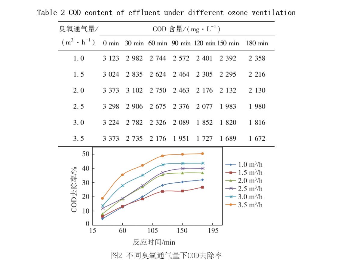 臭氧氧化試驗的進水為脫酚蒸氨出水,具體為出水通過管道進入裝置集水箱,集水箱內(nèi)設有泵機將廢水按一定流速從反應塔底部進水口進入反應塔,與通過管道從反應塔底部進氣口進入反應塔的臭氧接觸,進行臭氧氧化反應。采用單因素試驗按照制定的不同反應條件進行試驗,分別在0、30、60、90、120、150、180 min取樣,水樣采用0.45 μm膜過濾后分析檢測COD含量及去除率,確定主要影響因素即臭氧通氣量、催化劑投加量及臭氧濃度。