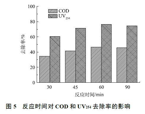 臭氧催化氧化實驗在室溫下進行,在廢水初始 pH 為 5,通過調節臭氧進氣濃度控制臭氧投加量為 300 mg·L−1 的條件下,考察了臭氧催化氧化時間對有機物去除效果的影響,結果如圖 5 所示。當反應時間從 30 min 增至 60 min 時,COD 和 UV254 的去除率分別從 34.6%、60.4% 升高到 46.4%、76.3%,有機物的去除率隨反應時間的延遲而增加。這是由于·OH 在水中的壽命很短 [22],大約 為 10−9 s,臭氧催化氧化中·OH 氧化反應實際發生在催化劑周圍,在傳質不充分的反應條件下,部分·OH 在未知有機物發生反應之前就已經被淬滅。當臭氧催化氧化時間縮短時,單位時間內臭氧投加量加大,產生的·OH 增多,導致大量·OH 未參與反應就淬滅,從而導致有機物去除率下降。當反應時間到達一定的臨界點時,再延長反應時間,其去除率增加不再明顯,臭氧催化氧化反應從 60 min延長至 90 min 時,COD 和 UV254 的去除率基本不變。