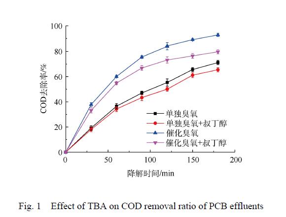 臭氧與有機(jī)物的反應(yīng)主要有 2種途徑,即直接反應(yīng)和間接反應(yīng)。直接反應(yīng)是指 O3直接氧化有機(jī)物,間接反應(yīng)主要是通過 O3分解產(chǎn)生的活性自由基對有機(jī)物進(jìn)行氧化。通過研究 · OH淬滅劑的影響進(jìn)行對比實(shí)驗(yàn),研究 · OH對有機(jī)物的降解作用。TBA 是一種常見的 · OH淬滅劑,它與臭氧分子基本不反應(yīng),反應(yīng)速率僅 3×10-3 L·(mol·s)−1,而其與 · OH的反應(yīng)速率高達(dá) 6×108 L·(mol·s)−1。因此,可以通過加入 TBA 到臭氧或催化臭氧過程,間接檢測體系中是否有 · OH 的產(chǎn)生。圖 1為單獨(dú)臭氧氧化過程以及催化臭氧氧化過程加入TBA前后廢液的 COD 去除率對比圖。由此可知,CaO催化臭氧氧化過程和單獨(dú)臭氧氧化過程加入 TBA后,處理 180 min后,COD去除率分別降低 13.04%和 5.71%,表明 TBA的加入對 2個(gè)過程降解率均造成負(fù)面影響,從而間接證明單獨(dú)臭氧氧化過程與催化臭氧氧化過程都有 · OH產(chǎn)生。此外,從 TBA對 2個(gè)過程的影響程度上可以看出,CaO可以促進(jìn) O3產(chǎn)生更多的 · OH,表明 CaO催化臭氧氧化過程遵循羥基自由基機(jī)理。