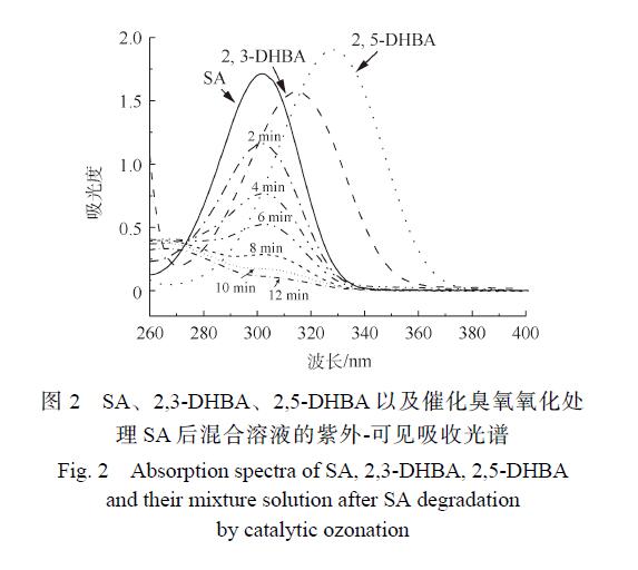 圖 2為 SA、2,3-DHBA和 2,5-BHBA的紫外-可見吸收光譜圖以及 CaO催化臭氧氧化處理后的紫外-可見吸收光譜。可以看出,SA在 302 nm處有 很大吸收峰,而 2,3-DHBA和 2,5-DHBA分別在315 nm和 330 nm處出現(xiàn) 很大吸收峰,SA經(jīng)過催化臭氧氧化處理后 很大吸收峰波長向右移動(dòng),在2,3-DHBA和 2,5-DHBA的大吸收峰處有一定的吸收,證明在該過程中有 · OH產(chǎn)生。