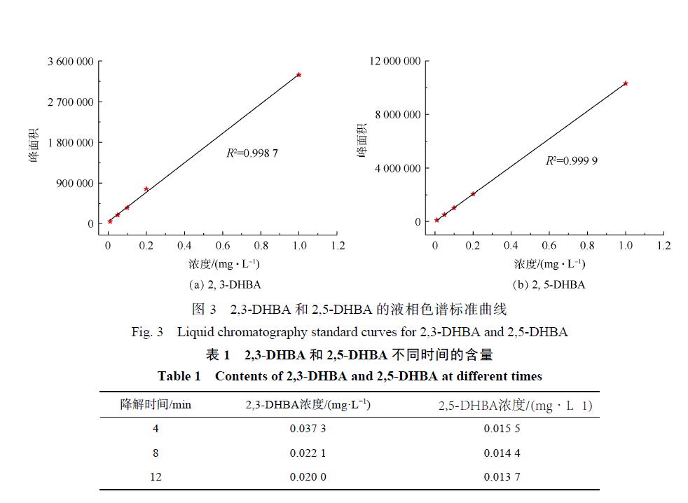 從圖2中可以觀察到2,3-DHBA和2,5-DHBA的存在,接下來使用LC-MS聯(lián)用儀對2,3-DHBA和 2,5-DHBA 的含量進(jìn)行定量分析。圖 3(a)和圖 3(b)分別表示 2,3-DHBA 和 2,5-DHBA的液相色譜標(biāo)準(zhǔn)曲線,根據(jù)該標(biāo)準(zhǔn)曲線求得 CaO催化臭 氧 處 理 不 同 時(shí) 間 溶 液 中 2,3-DHBA和 2,5-DHBA的含量,結(jié)果如表 1所示。