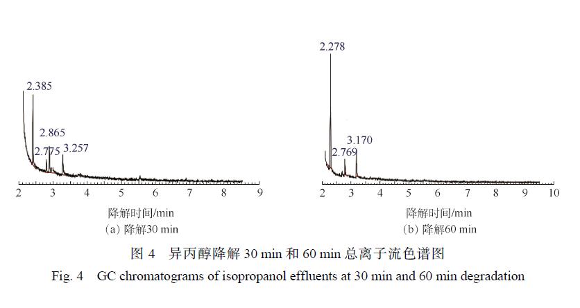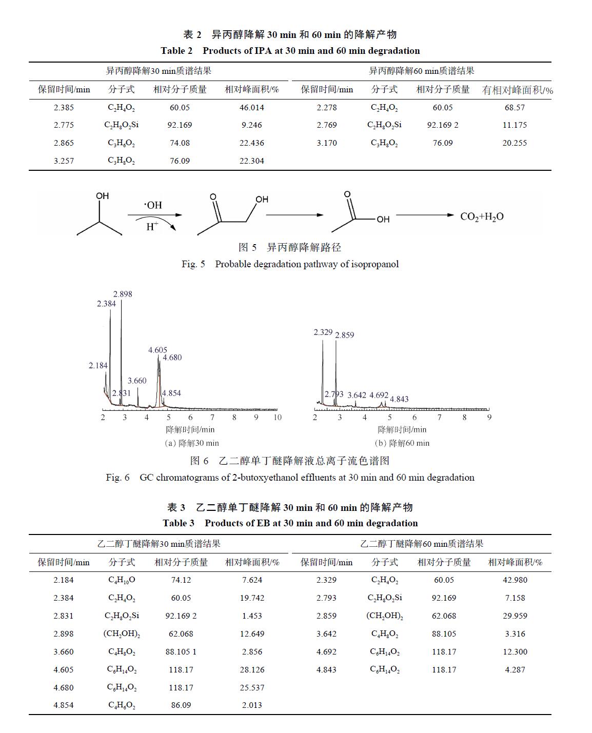 為了研究廢液的降解路徑,以廢液主要成分異丙醇和乙二醇單丁醚為例進(jìn)行探討,對 2種物質(zhì)進(jìn)行降解并對降解產(chǎn)物用GC/MS進(jìn)行檢測。