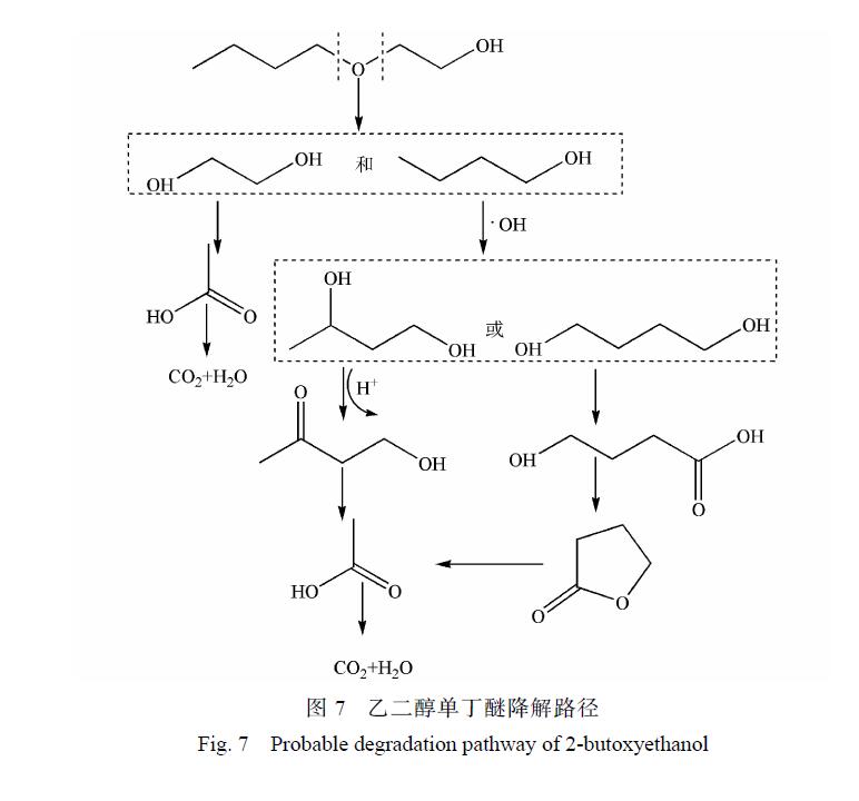 另外有一部分乙二醇單丁醚被氧化斷鏈形成 1-丁醇,1-丁醇與 · OH 結(jié)合,結(jié)合產(chǎn)物再被氧化形成酮或酸, 很后再被氧化形成小分子酸乙酸, 很后形成CO2和H2O。