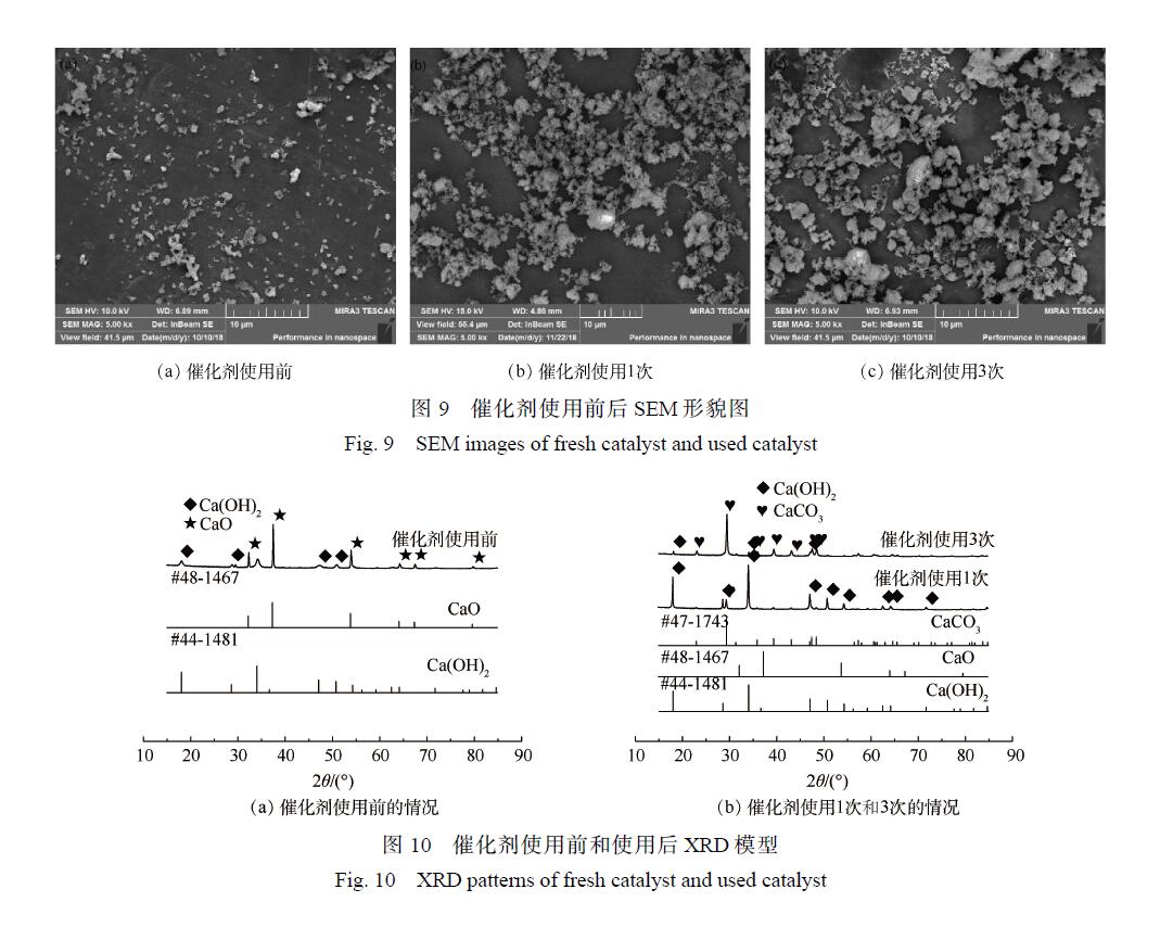 圖 10(b)為催化劑使用 1次和使用 3次后的 XRD圖。催化劑使用 1次后的 XRD譜圖在 2θ為18°、28.7°、34.1°、47.1°和 50.9°處存在較強(qiáng)的峰,這些峰與 Ca(OH)2的特征峰一致,表明其主要成分是 Ca(OH)2。而使用 3次的催化劑測出的 2θ為 23°、 29.4°、 39.4°、 43.2°和 47.1°對應(yīng)的峰 是CaCO3的特征峰,說明催化劑的失活過程主要是:經(jīng)過多次循環(huán)后的催化劑與水結(jié)合變成了Ca(OH)2,形成的 Ca(OH)2與礦化產(chǎn)物 CO2結(jié)合從而變?yōu)?CaCO3, 很終由于多次反應(yīng)后 CaCO3含量不斷增加從而導(dǎo)致催化劑催化效率逐漸降低。