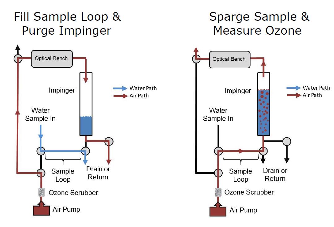 圖 1是水臭氧監(jiān)測(cè)儀的示意圖。四個(gè) 2 通閥和一個(gè) 1 通閥引導(dǎo)空氣和水流通過(guò)設(shè)備。測(cè)量溶解臭氧的過(guò)程包括兩個(gè)步驟。在第一步(圖 1 的左圖)中,樣品環(huán)中充滿了來(lái)自待分析水源的加壓水流,內(nèi)部空氣泵對(duì)撞擊器加壓以清空前一個(gè)樣品中的臭氧消耗水.在第二步中,改變閥門(mén)狀態(tài),使來(lái)自空氣泵/洗滌器的不含臭氧的空氣都將約 2 mL 水樣推入沖擊器并噴射樣品,富含臭氧的空氣通過(guò)光具座,其中臭氧被測(cè)量。每個(gè)步驟大約需要 5 秒,每 10 秒報(bào)告一次新的臭氧測(cè)量值。