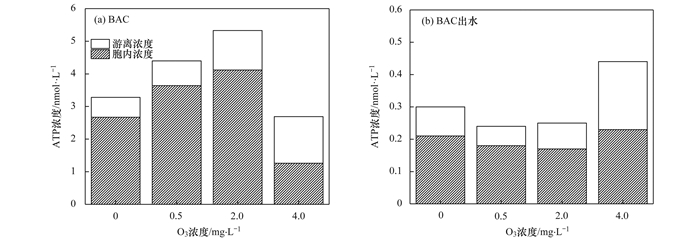 但臭氧濃度為4.0 mg·L-1時, BAC上ATP濃度降低了17.99%, 且有占比56.16%的ATP屬于游離ATP;測定BAC出水中ATP, 在4.0 mg·L-1的臭氧條件下, BAC出水中ATP含量與2.0 mg·L-1相比增加了76.00%.一般游離ATP表示外來因素導致微生物釋放出的胞外ATP[33, 34], 過高的臭氧使BAC上微生物細胞受損甚至失活, 同時微生物在BAC載體上的附著能力減弱, 出水中的ATP濃度升高;同時在BAC出水的EEM表征中發現代表蛋白質(區域Ⅰ)和SMPs類(區域Ⅲ)熒光強度分別增加46.23%和63.72%, 這表明過高臭氧濃度不僅導致微生物活性降低, 同時微生物細胞受損甚至失活釋放出有機物, 導致BAC出水中蛋白質和SMPs物質增加.