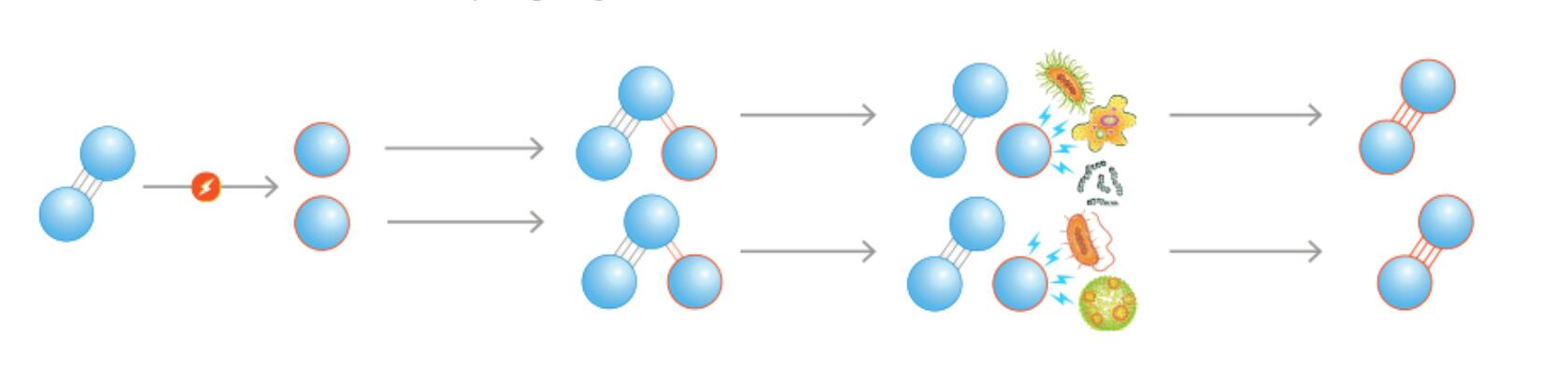 臭氧發(fā)生器使用光能或電能以及來自周圍空氣的氧氣。當添加這種能量時,常規(guī)氧分子(O 2)分裂成兩個單獨的原子(O 1)。然后O 1原子與其他氧分子(O 2)結合,產生O 3。光能與電能產生的臭氧之間的區(qū)別是數(shù)量 - 發(fā)電產生更高的臭氧輸出。當溶解在水中時,臭氧會殺死病原體和微生物,破壞有機物和無機物,并且還會通過氧化分解氯胺。
